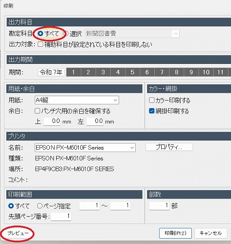 「総勘定元帳」で「すべて」を選択し、「プレビュー」をクリックすると、年間の収支状況が勘定科目ごとに分かるため便利です。