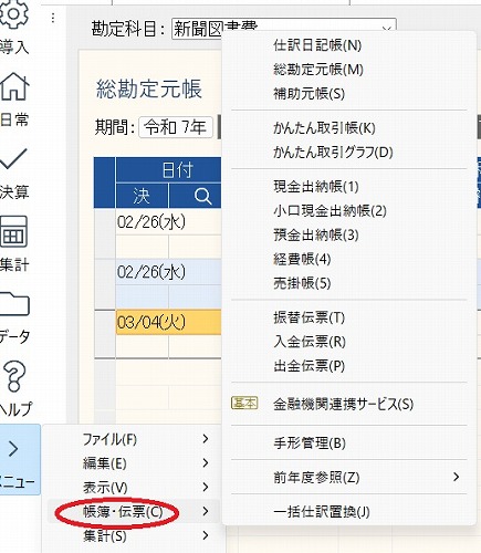 管理画面で「メニュー」の「帳簿」を選択すると、帳簿類一覧が表示され、その中には「仕訳日記帳」も含まれます。